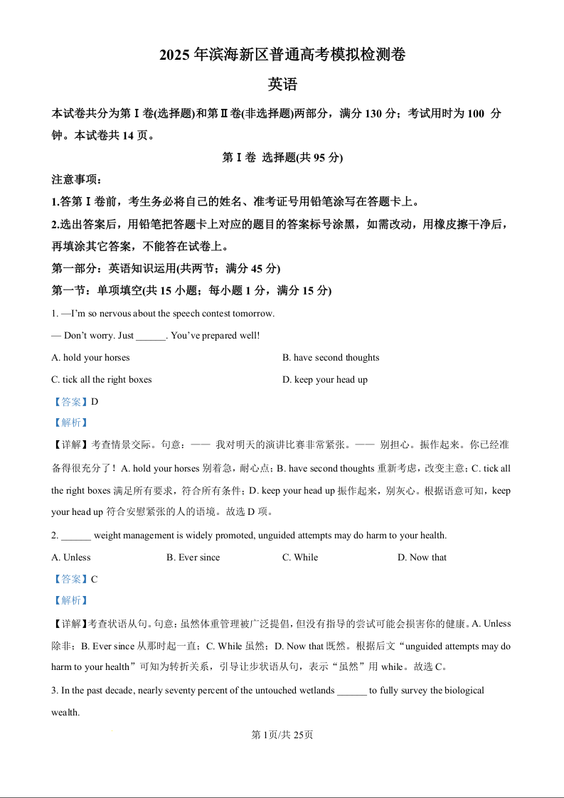 天津市滨海新区2025届高三下学期三模英语(精品解析版)