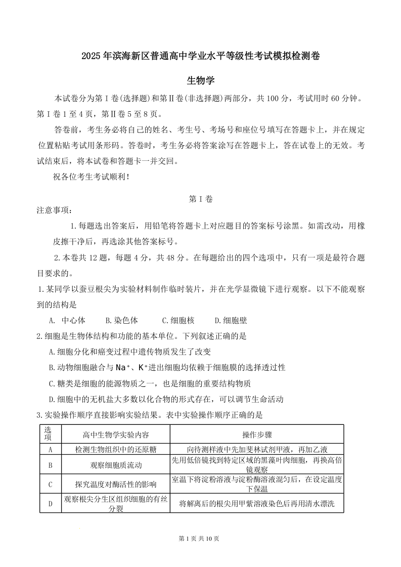 天津市滨海新区2025届高三下学期三模生物