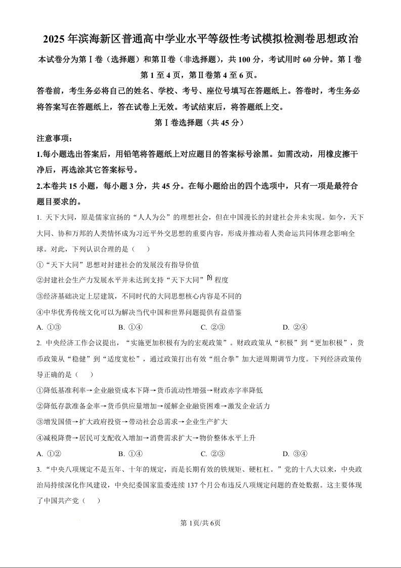 天津市滨海新区2025届高三下学期三模政治(原卷版)