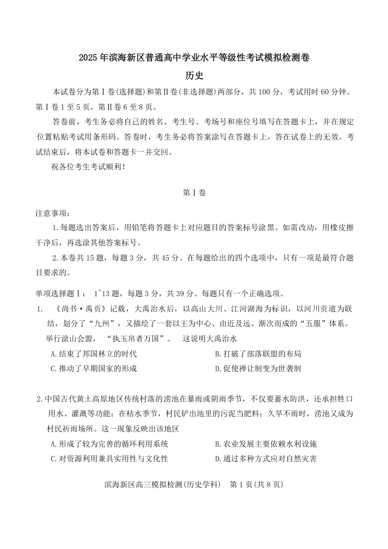 天津市滨海新区2025届高三下学期三模历史