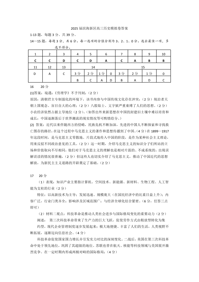 天津市滨海新区2025届高三下学期三模历史答案