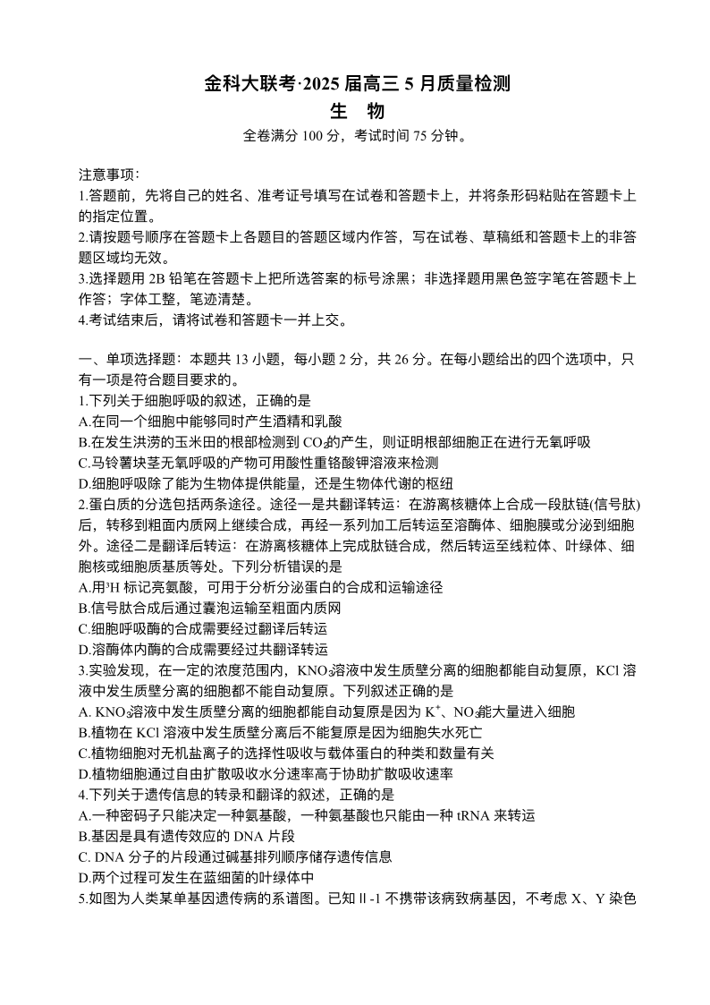 河南省金科新未来2025届高三下学期5月联考生物+答案