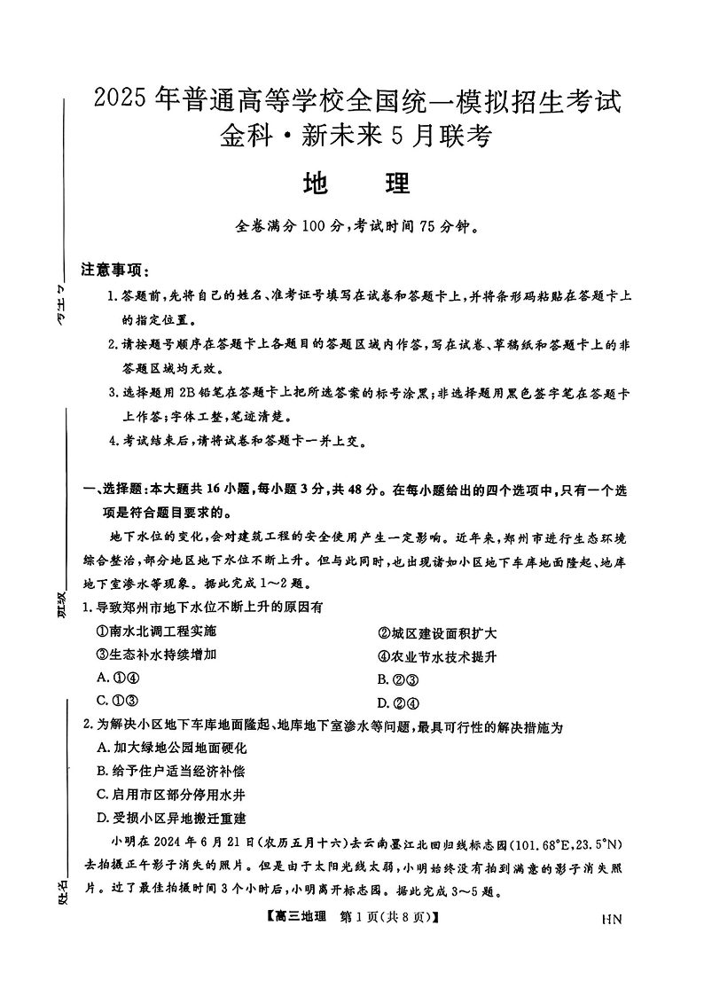 河南省金科新未来2025届高三下学期5月联考地理+答案