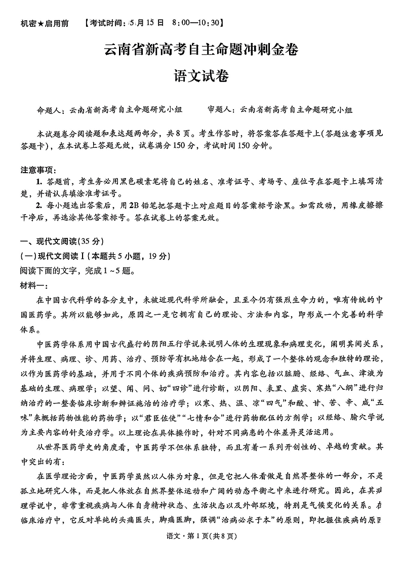 云南省2025年新高考自主命题冲刺金卷语文+答案