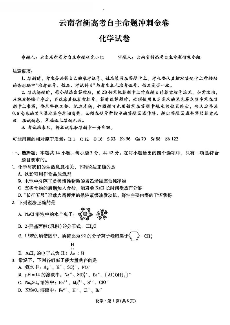 云南省2025年新高考自主命题冲刺金卷化学+答案