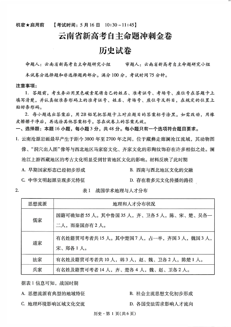 云南省2025年新高考自主命题冲刺金卷历史+答案