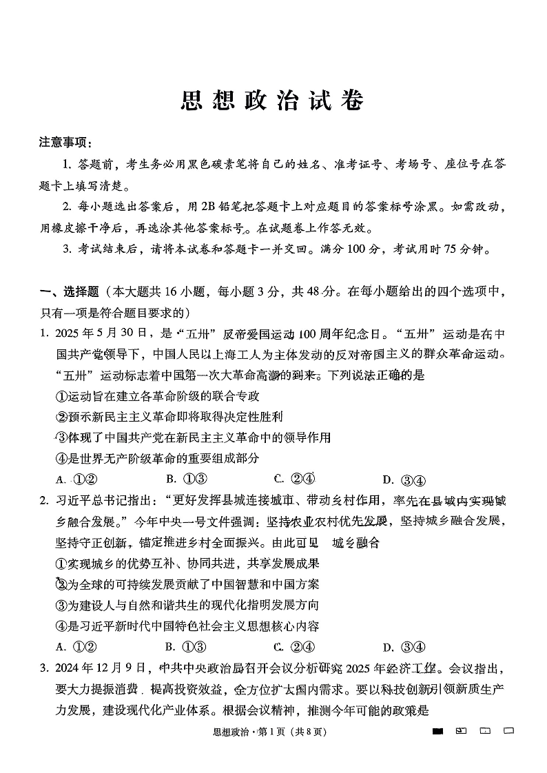 云南省师大附中2025届高考适应性月考卷(九)政治+答案