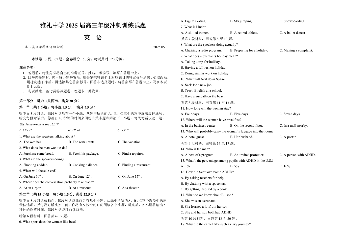 湖南省长沙市雅礼中学2025届高三下学期冲刺模拟训练英语