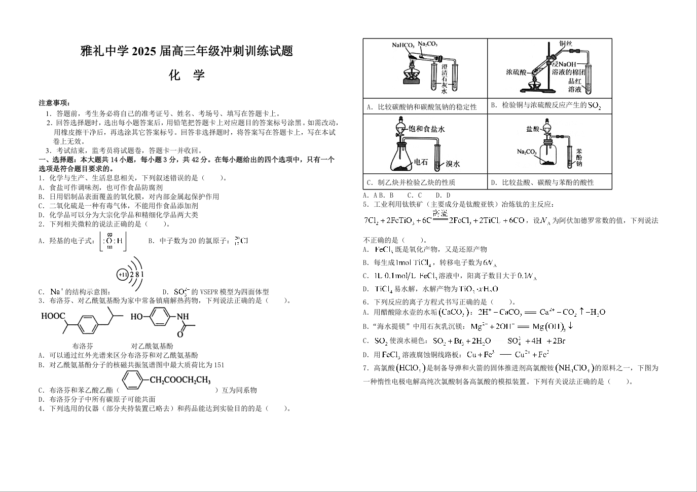 湖南省长沙市雅礼中学2025届高三下学期冲刺模拟训练化学