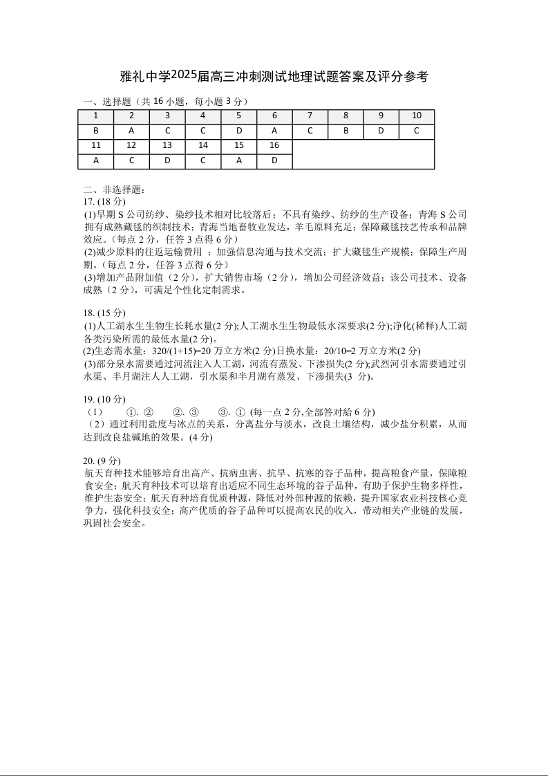 湖南省长沙市雅礼中学2025届高三下学期冲刺模拟训练地理答案