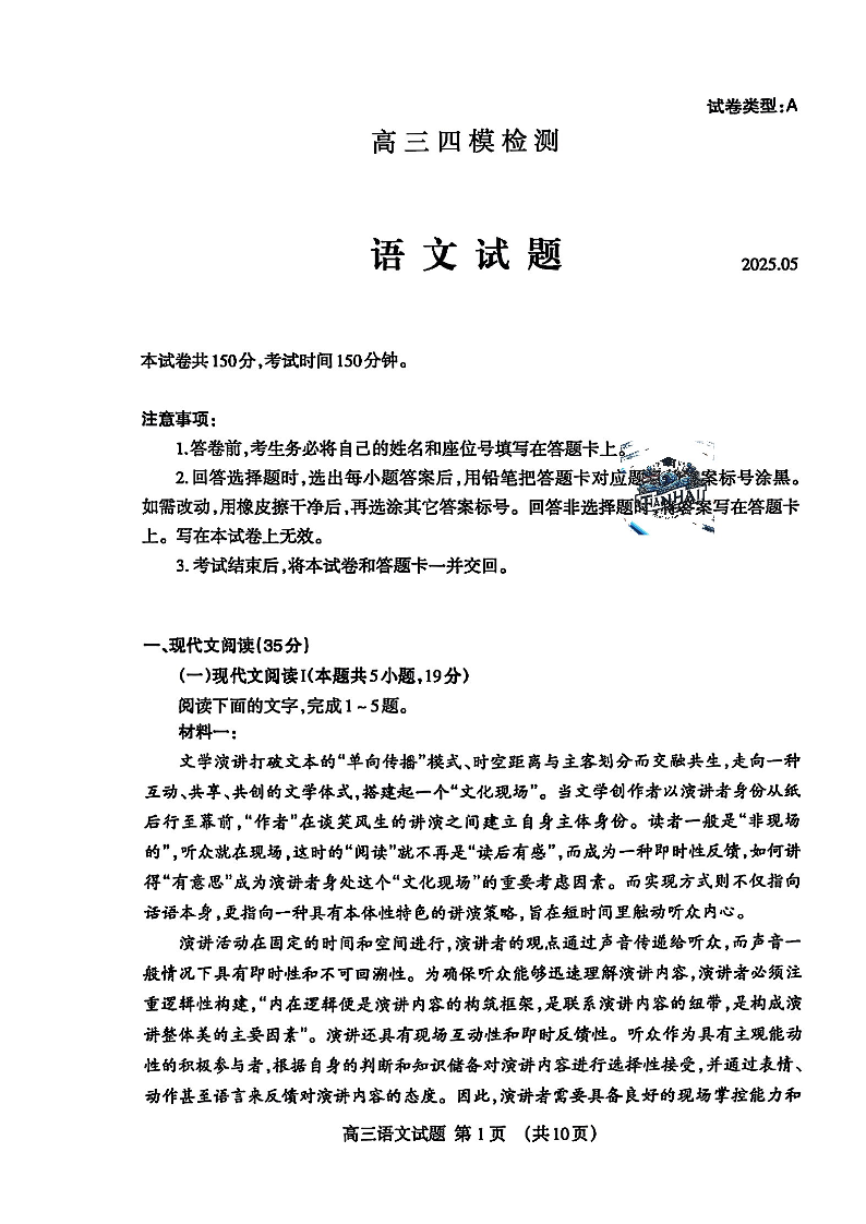 山东省泰安市2025届高三下学期5月四模检测语文