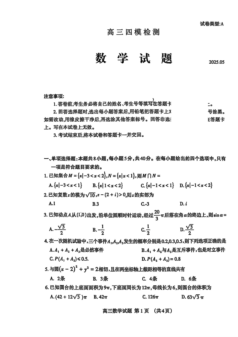 山东省泰安市2025届高三下学期5月四模检测数学