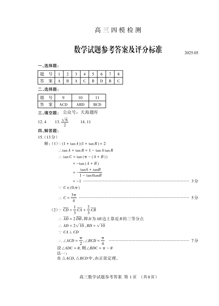 山东省泰安市2025届高三下学期5月四模检测数学答案