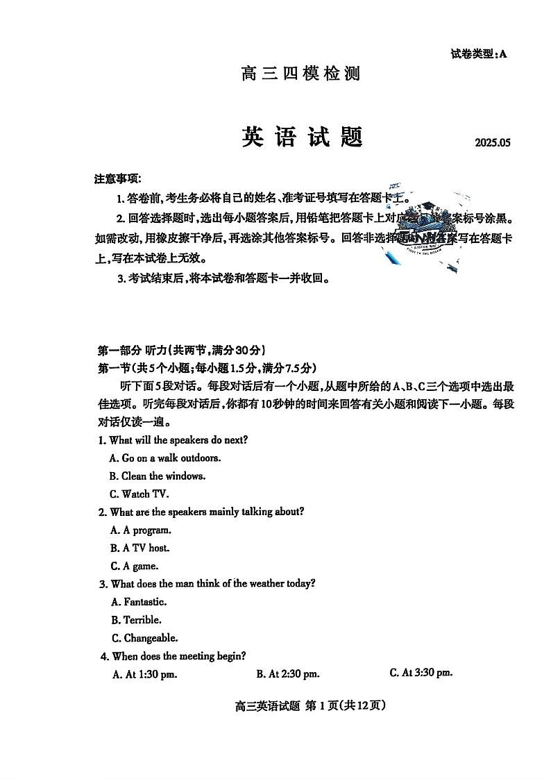 山东省泰安市2025届高三下学期5月四模检测英语