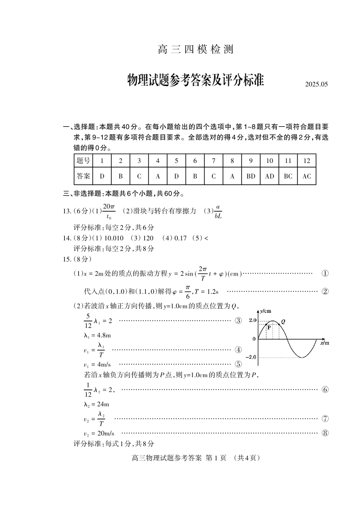 山东省泰安市2025届高三下学期5月四模检测物理答案
