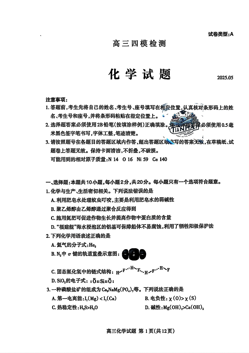 山东省泰安市2025届高三下学期5月四模检测化学