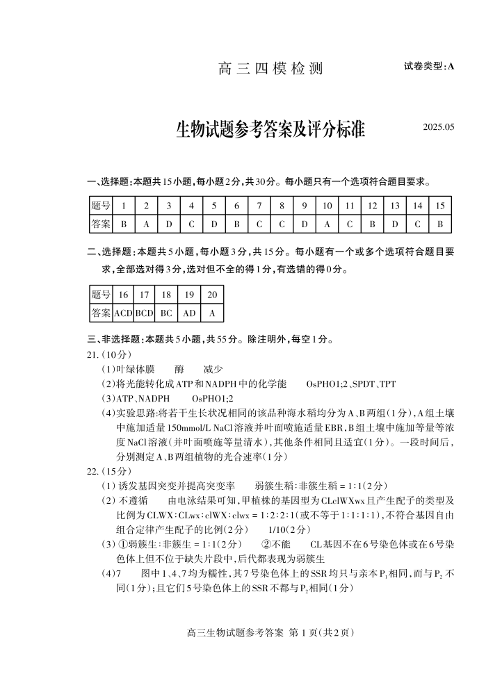 山东省泰安市2025届高三下学期5月四模检测生物答案