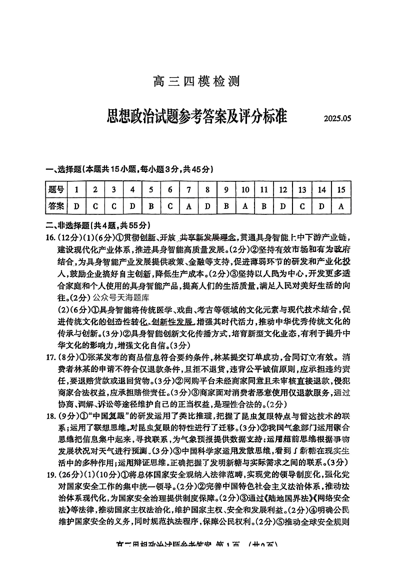 山东省泰安市2025届高三下学期5月四模检测政治答案