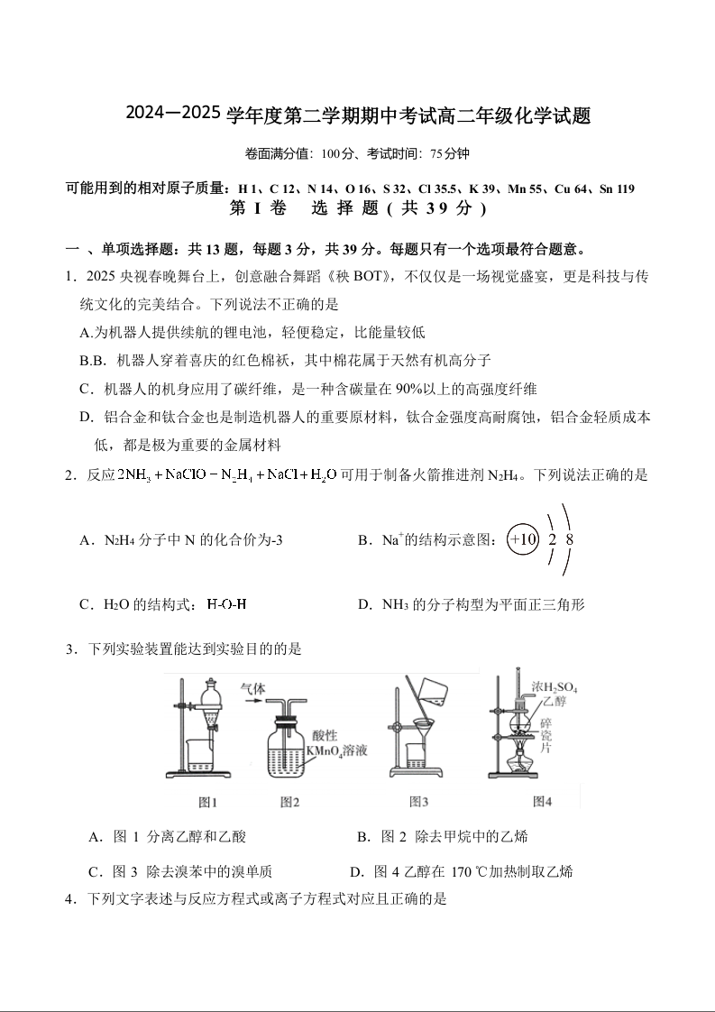 江苏省盐城市五校2024-2025学年下学期5月高二期中化学+答案