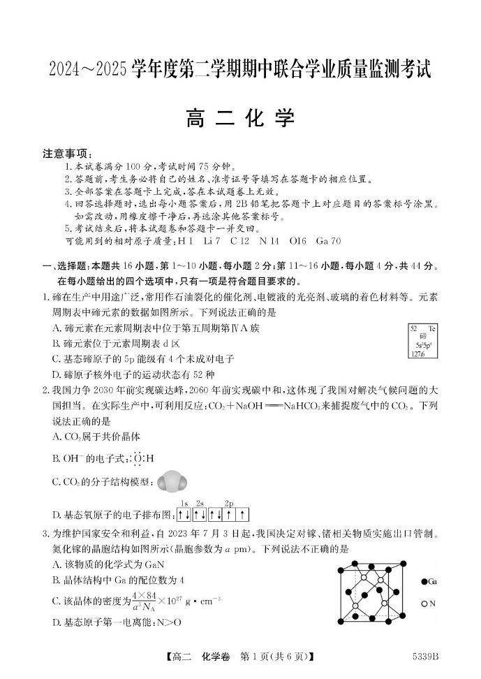 广东省清远市2024-2025学年下学期高二期中考试化学+答案