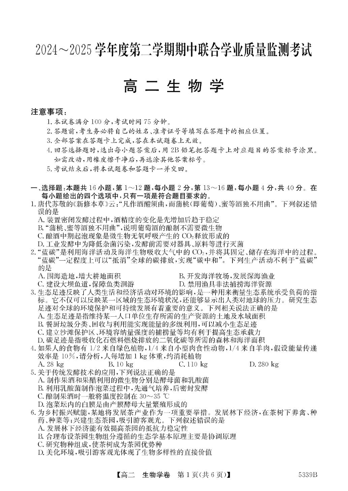 广东省清远市2024-2025学年下学期高二期中考试生物+答案