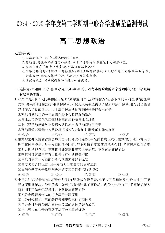广东省清远市2024-2025学年下学期高二期中考试政治+答案