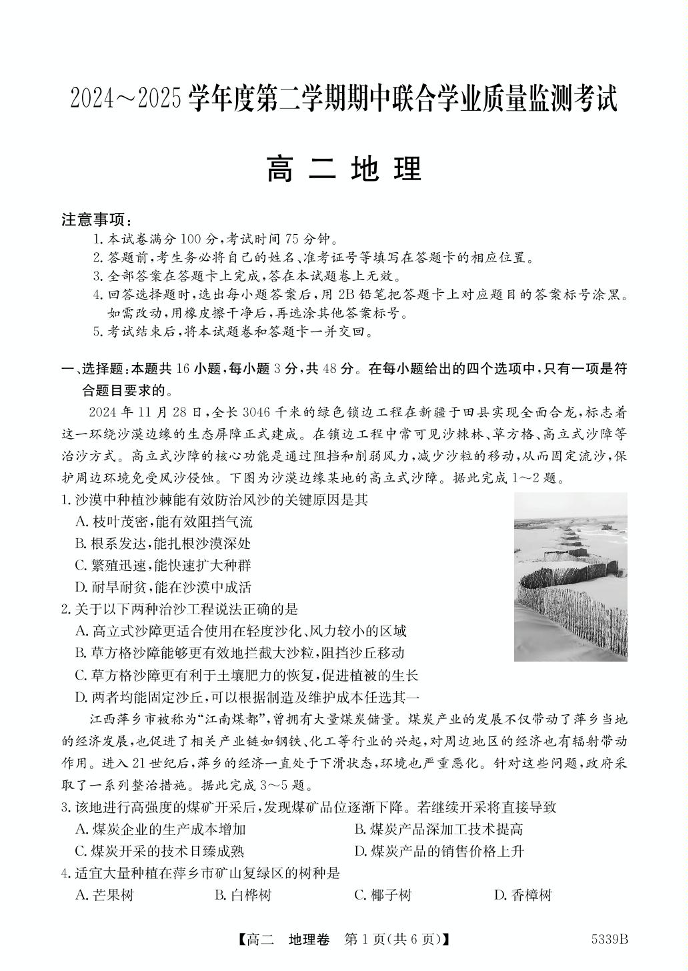 广东省清远市2024-2025学年下学期高二期中考试地理+答案