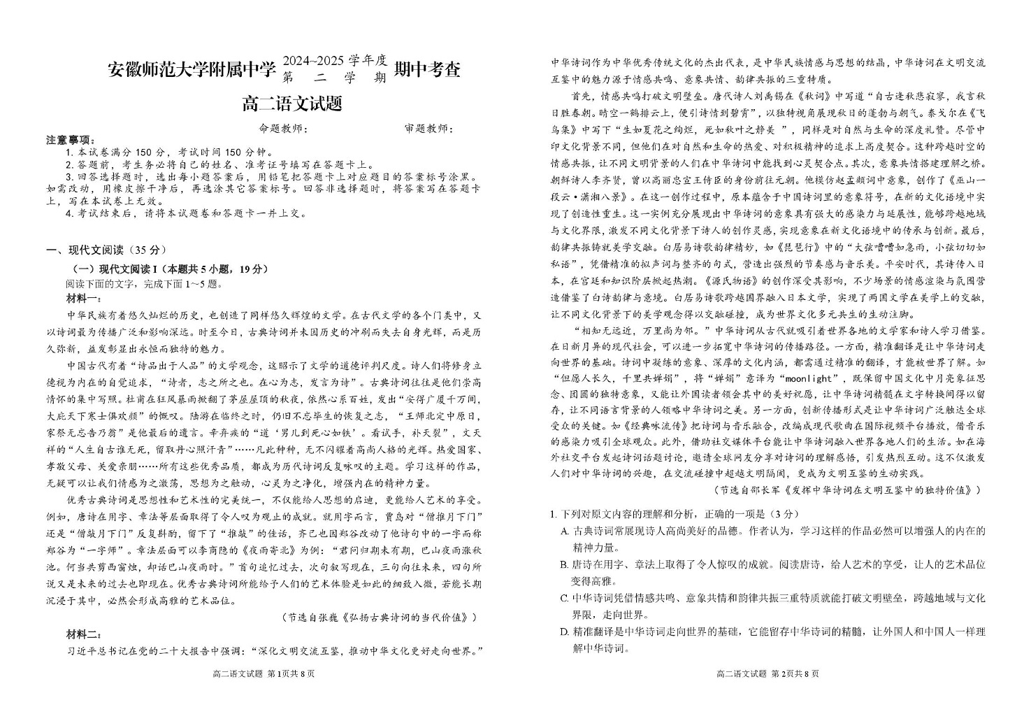 安徽省师大附中2024-2025学年下学期4月高二期中考试语文