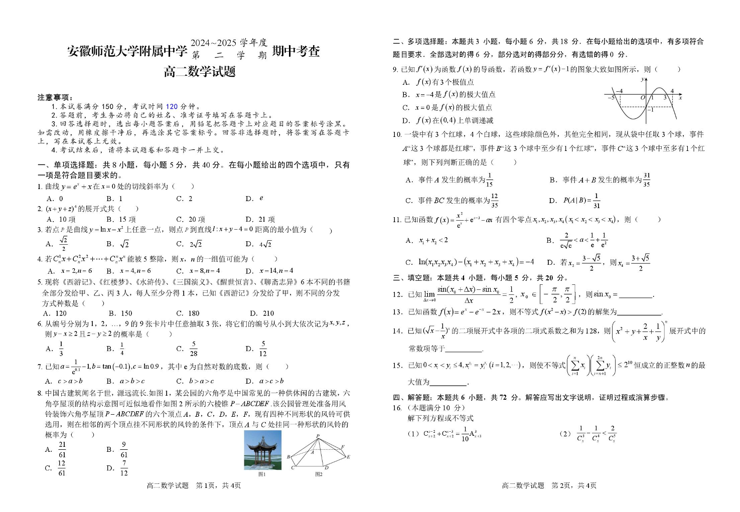 安徽省师大附中2024-2025学年下学期4月高二期中考试数学+答案