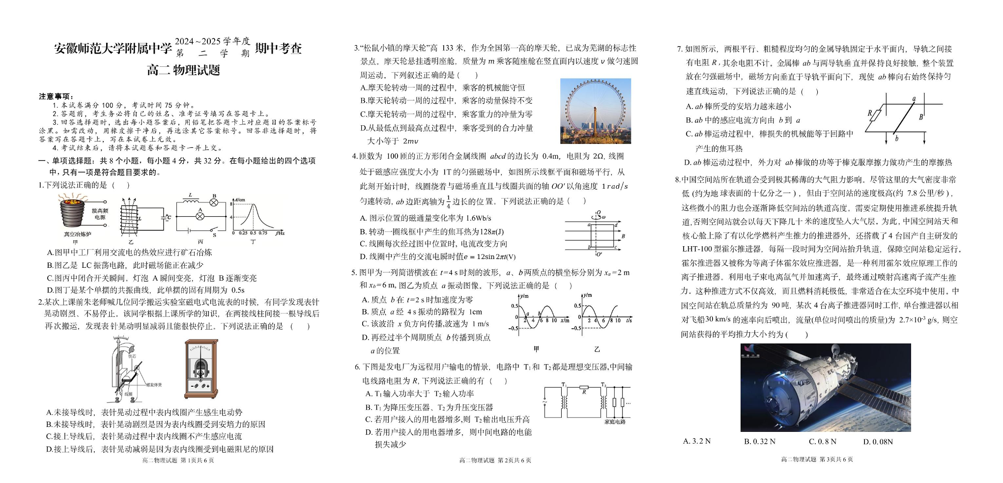 安徽省师大附中2024-2025学年下学期4月高二期中考试物理+答案