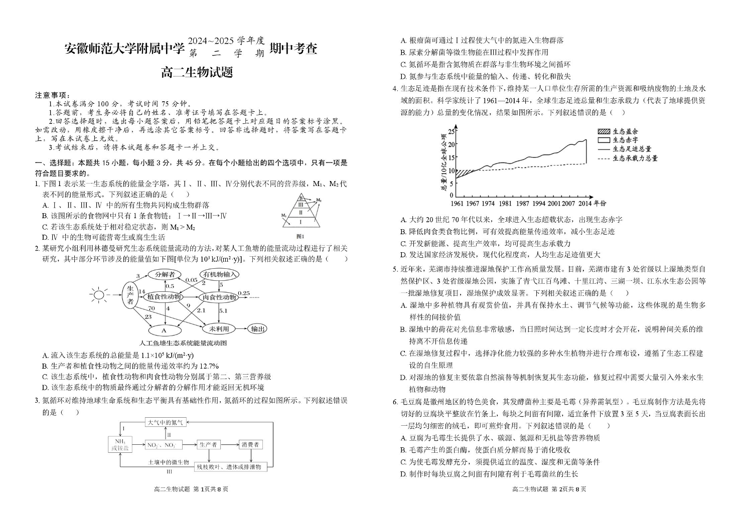 安徽省师大附中2024-2025学年下学期4月高二期中考试生物