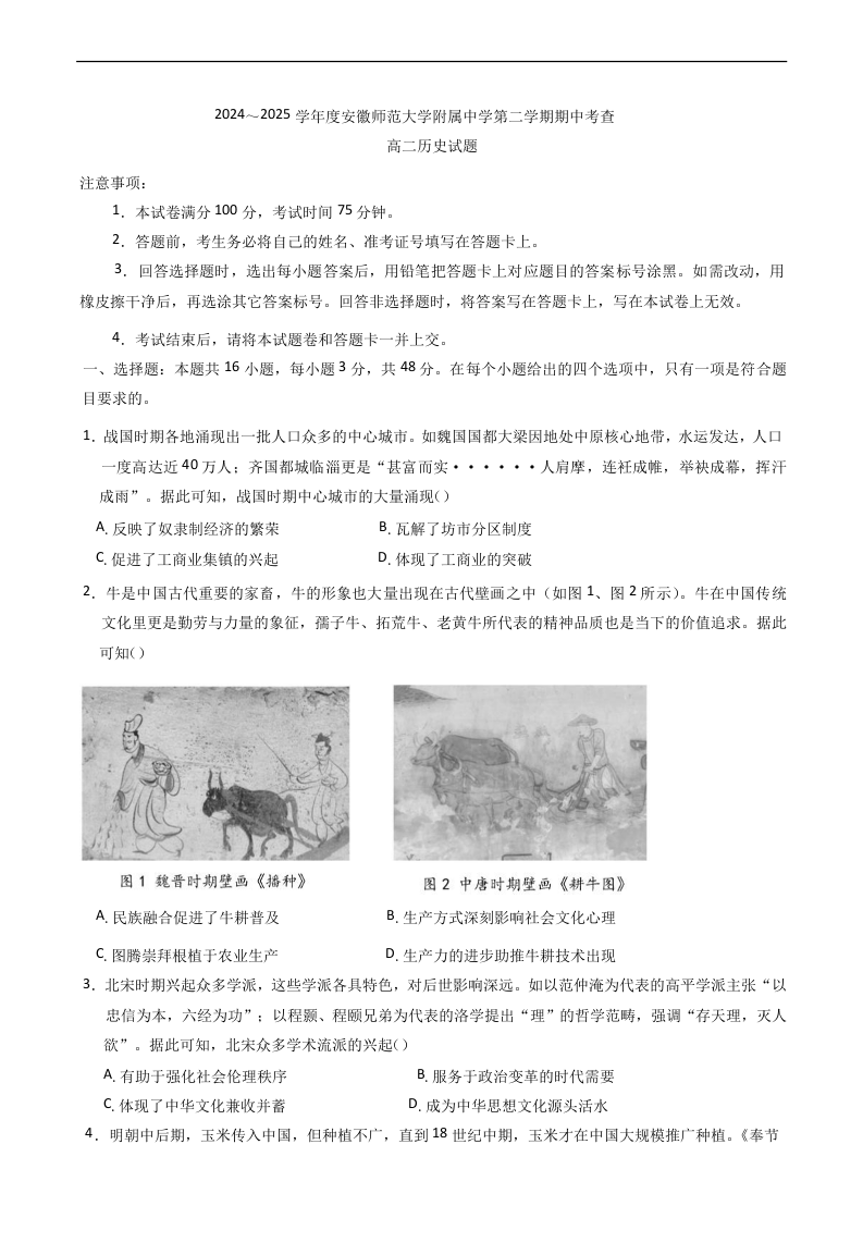 安徽省师大附中2024-2025学年下学期4月高二期中考试历史+答案