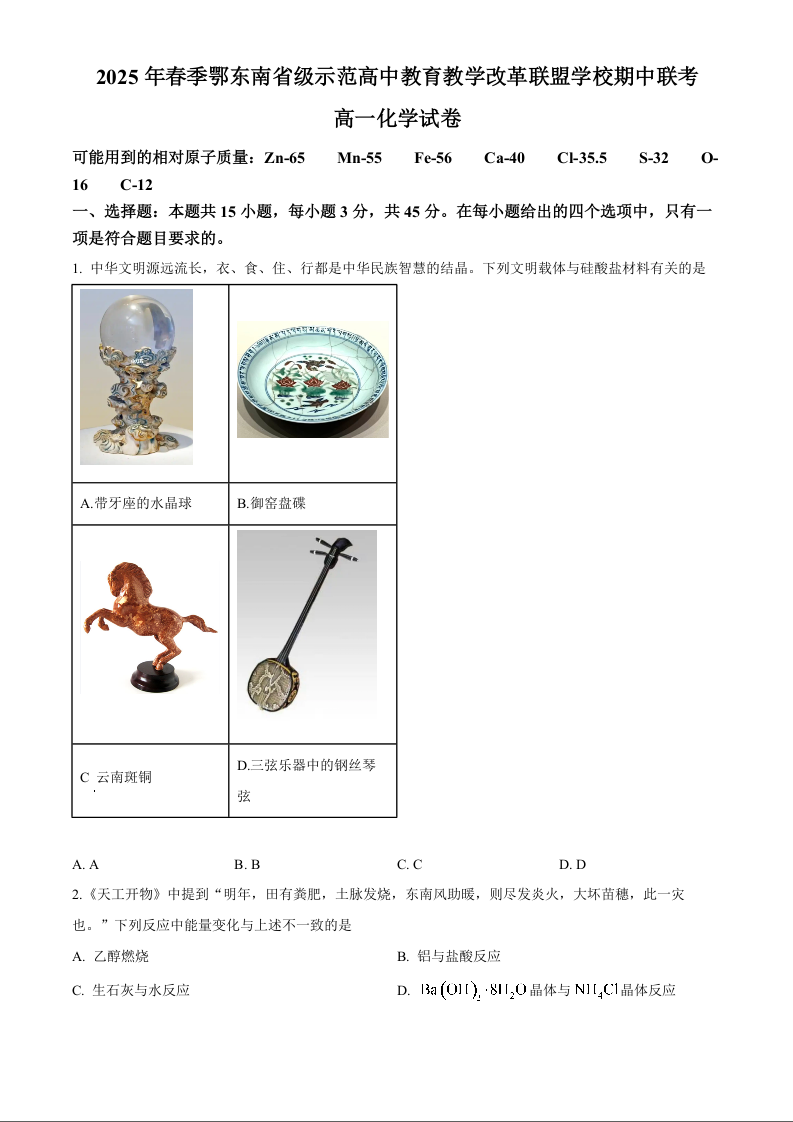 湖北省鄂东南省级示范高中2024-2025学年下学期4月高一联考化学+答案