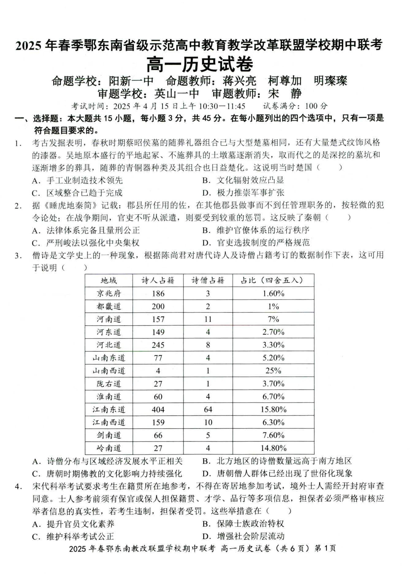 湖北省鄂东南省级示范高中2024-2025学年下学期4月高一联考历史