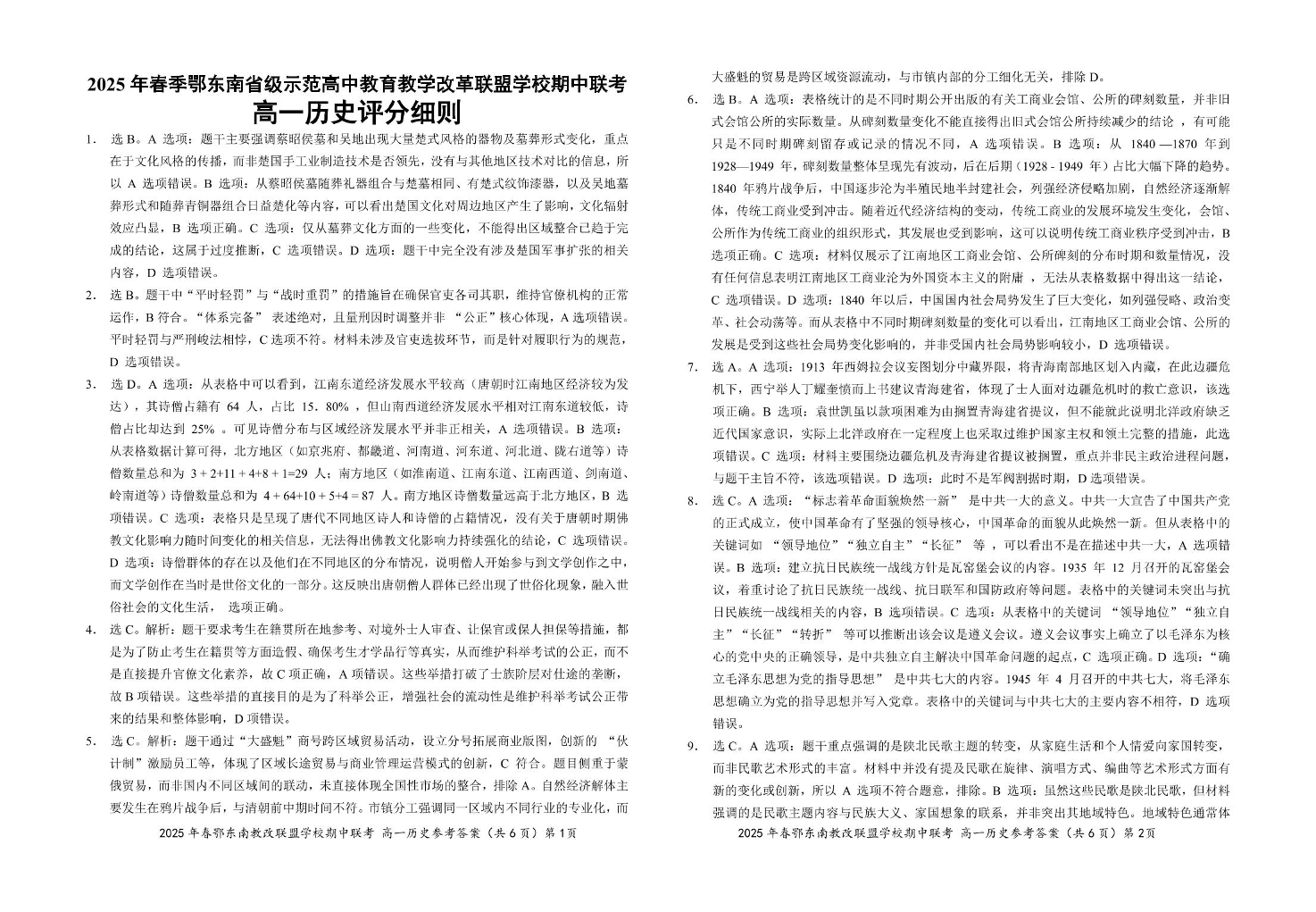 湖北省鄂东南省级示范高中2024-2025学年下学期4月高一联考历史答案