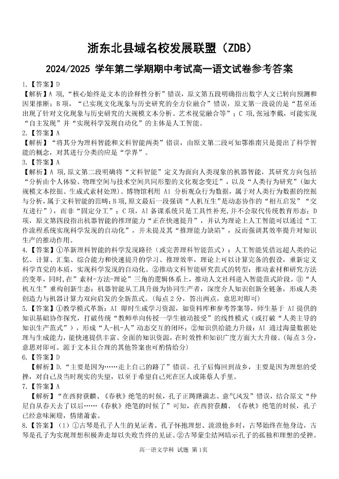浙江省ZDB名校发展联盟2024-2025学年下学期4月高一期中考试语文答案