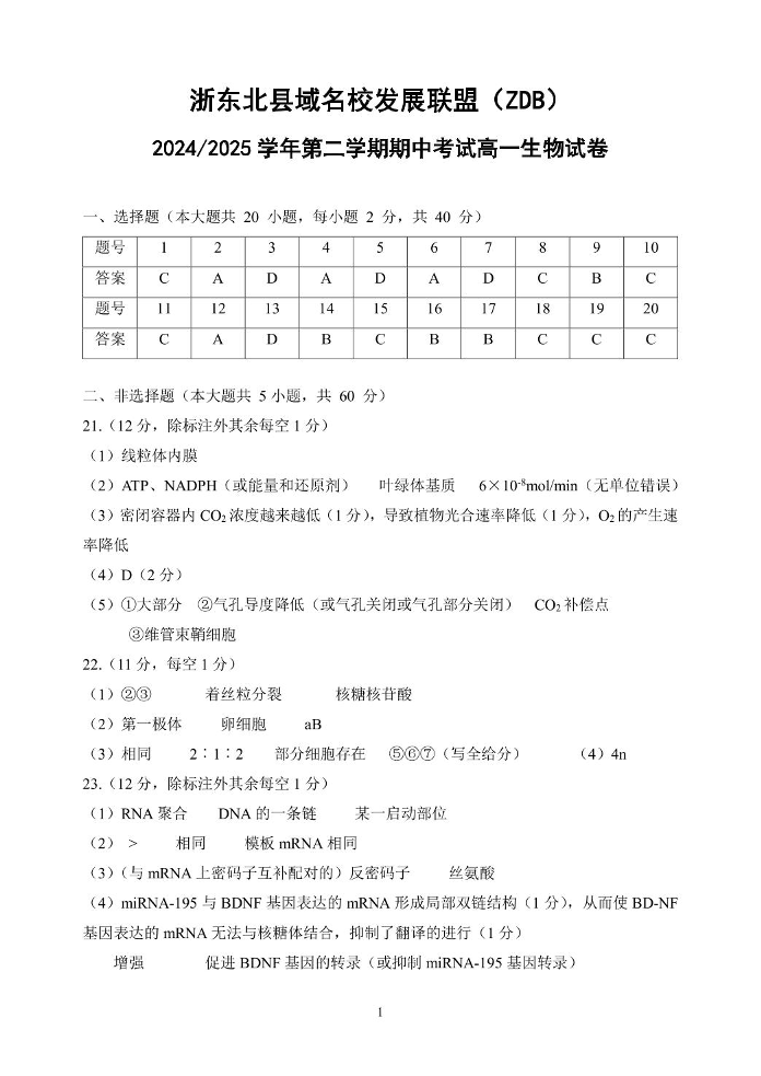 浙江省ZDB名校发展联盟2024-2025学年下学期4月高一期中考试生物答案