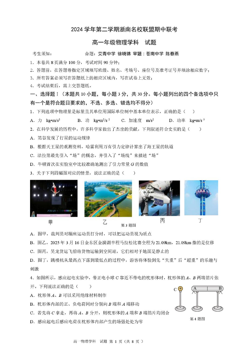 浙江省浙南名校2024-2025学年下学期4月高一期中联考物理+答案