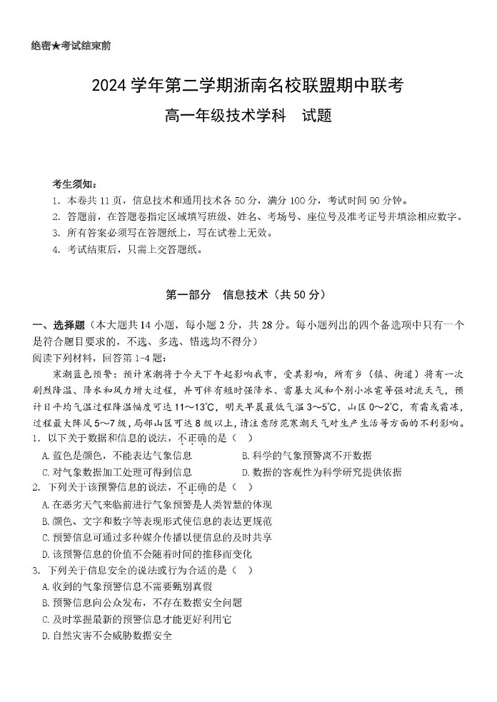 浙江省浙南名校2024-2025学年下学期4月高一期中联考信息技术+答案