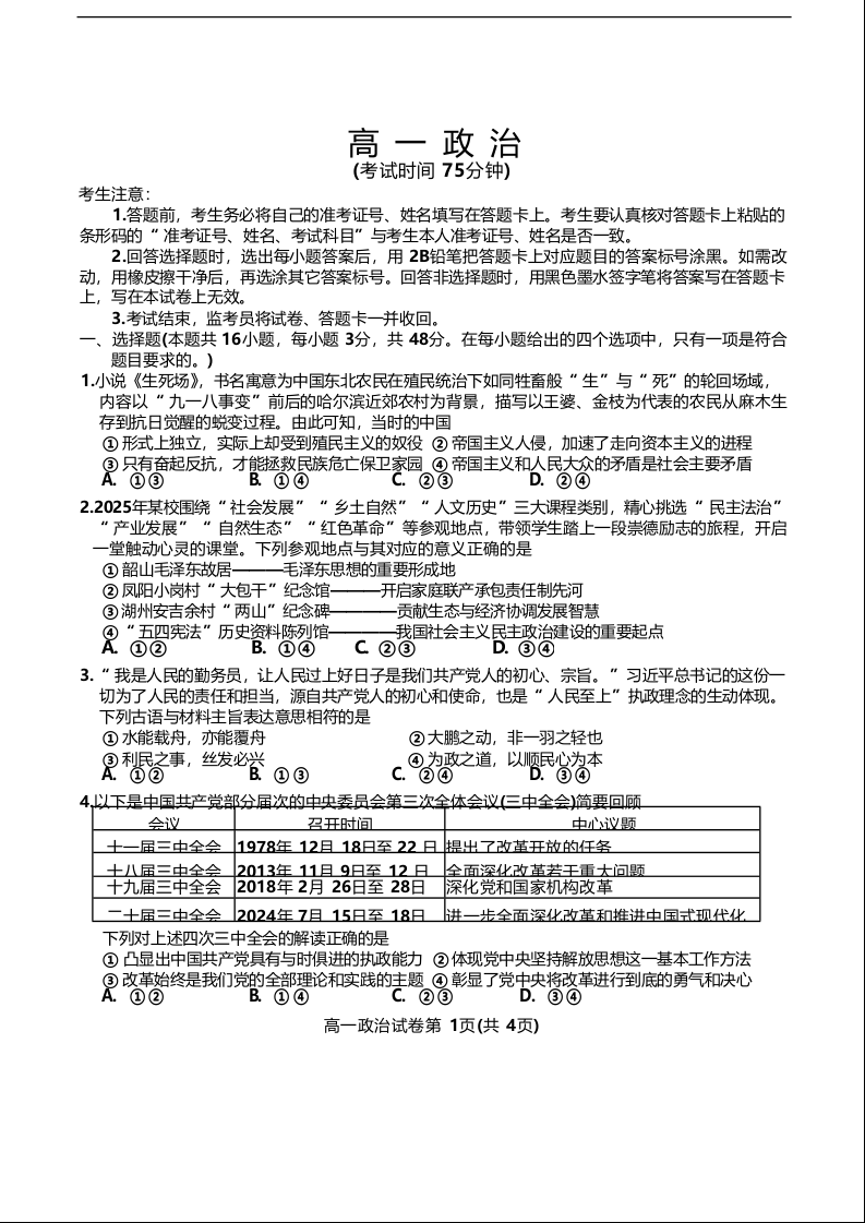 江西省萍乡市2024-2025学年下学期4月高一期中考试政治+答案