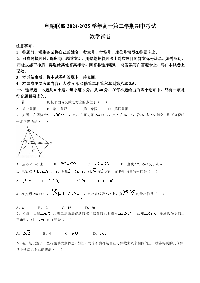 河北省邢台市卓越联盟2024-2025学年下学期高一期中考试数学+答案