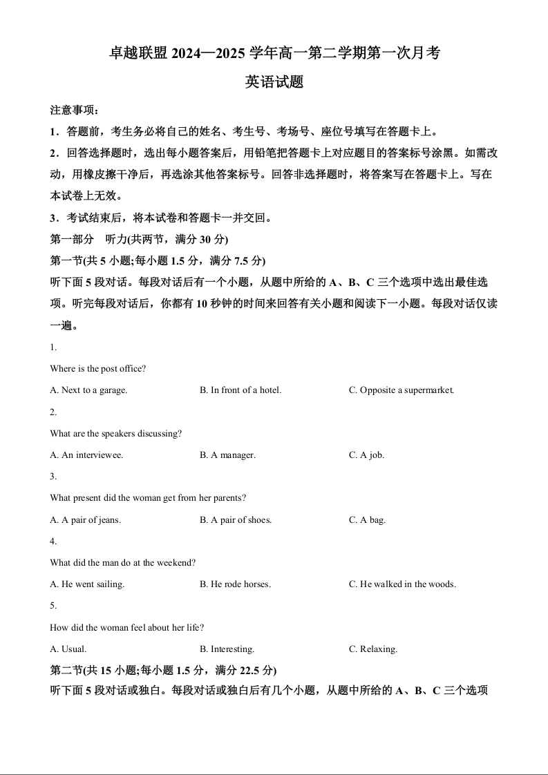 河北省邢台市卓越联盟2024-2025学年下学期高一期中考试英语+答案