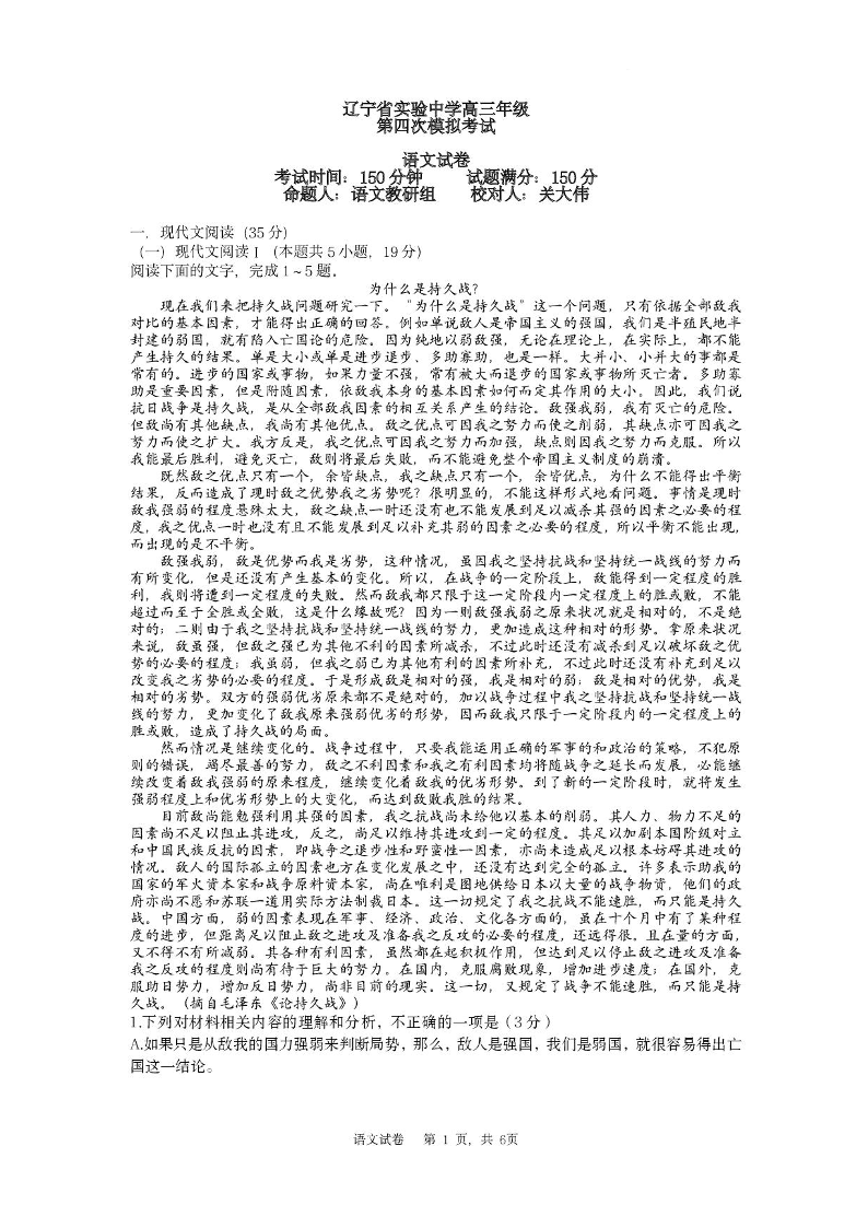 辽宁省实验中学2025届高三下学期第四次模拟考试语文+答案