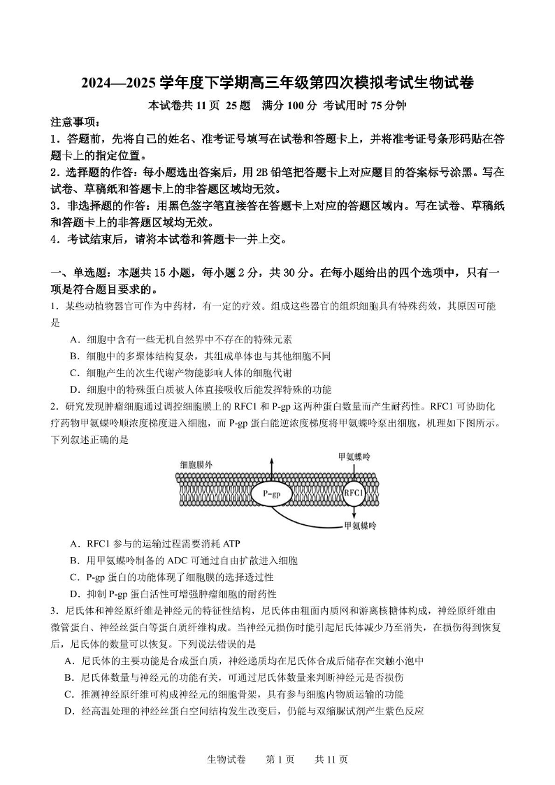 辽宁省实验中学2025届高三下学期第四次模拟考试生物+答案