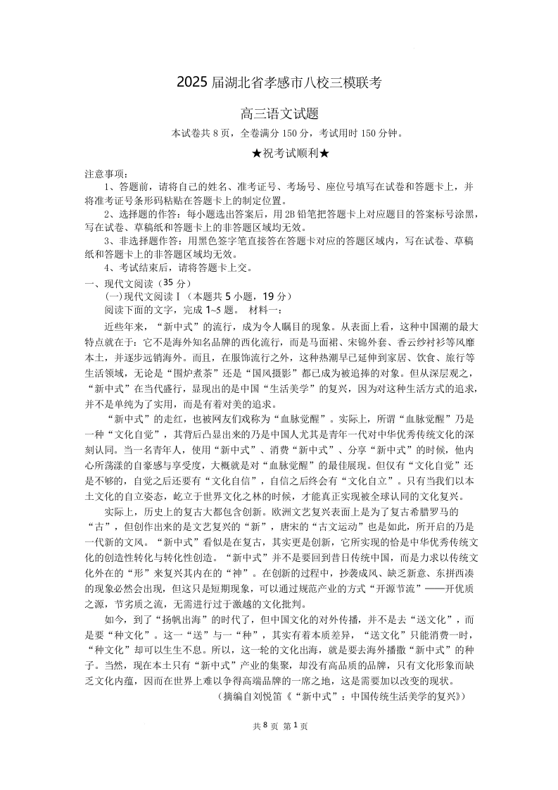 湖北省孝感市八校2025届高三下学期5月三模联考语文
