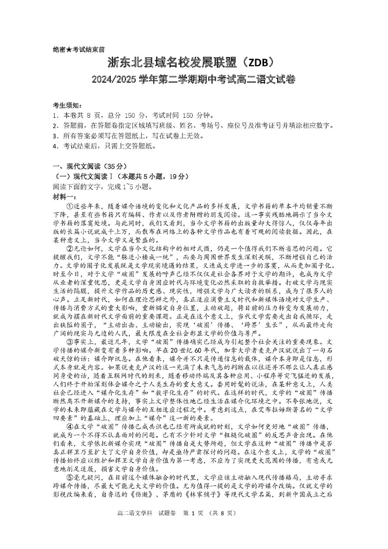 浙江省ZDB名校发展联盟2024-2025学年下学期4月高二期中考试语文+答案