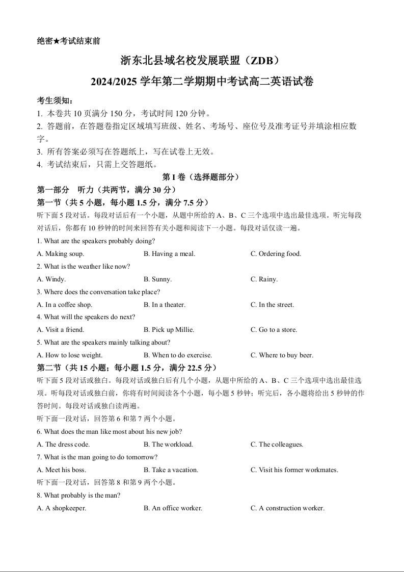 浙江省ZDB名校发展联盟2024-2025学年下学期4月高二期中考试英语+答案