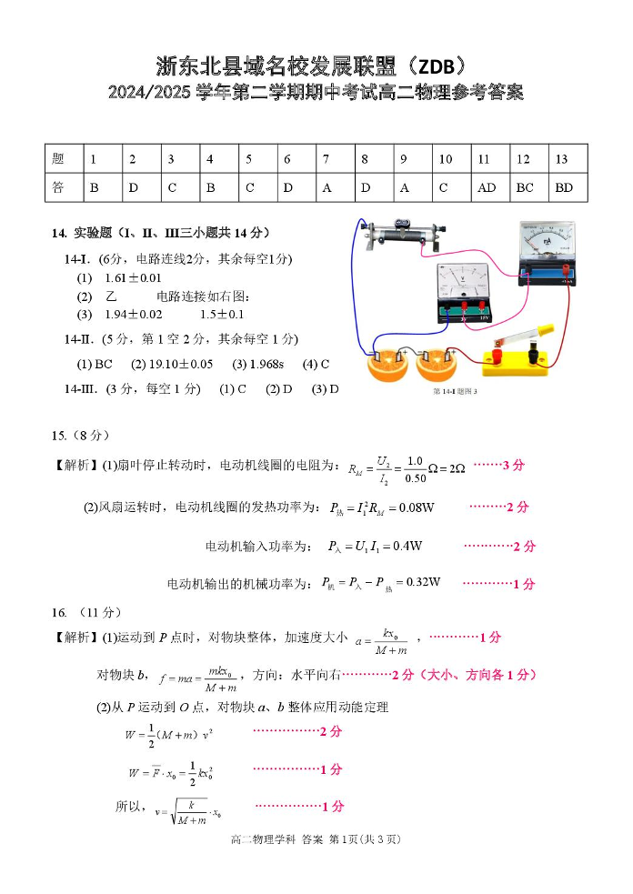 浙江省ZDB名校发展联盟2024-2025学年下学期4月高二期中考试物理答案