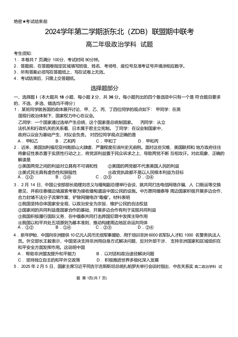 浙江省ZDB名校发展联盟2024-2025学年下学期4月高二期中考试政治