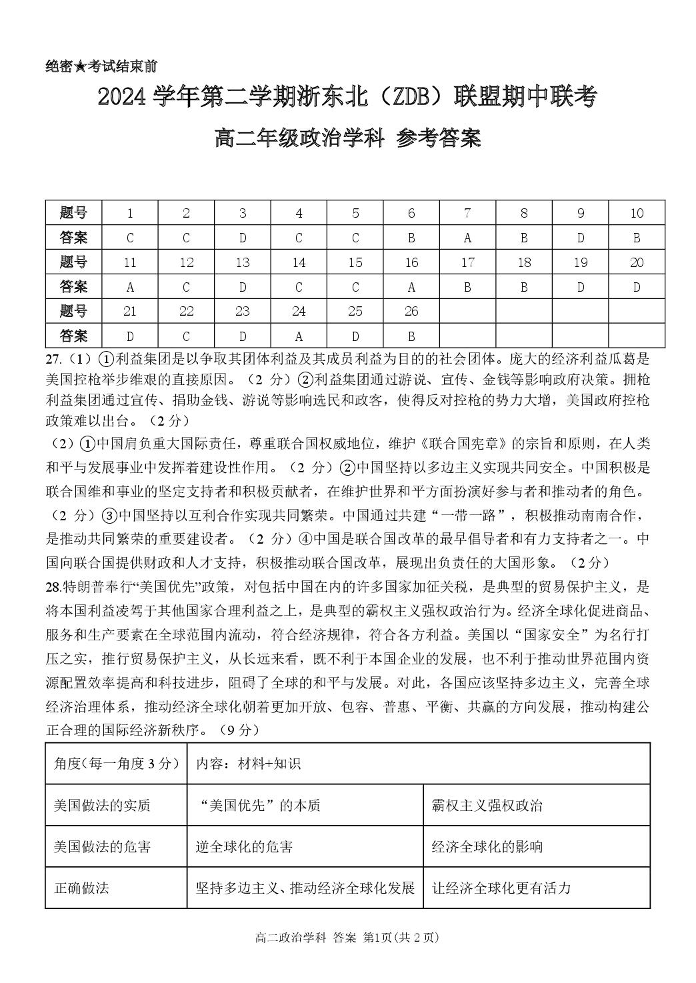 浙江省ZDB名校发展联盟2024-2025学年下学期4月高二期中考试政治答案